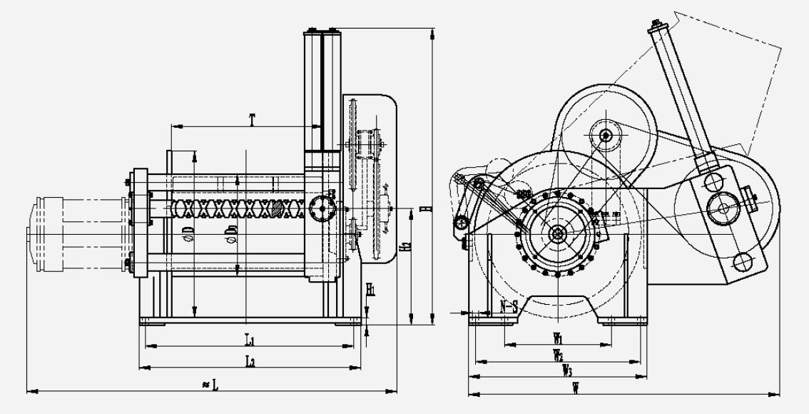 Seriekode | Model | 1. lag | Diameter af reb | Lag | Kapacitet af reb | Model af elektromotor | Parameter for elektromotor | Forhold | Magt | D0 | D | T | L1 | L2 | L | W1 | W2 | W3 | W | H1 | H2 | H | N | S | ||